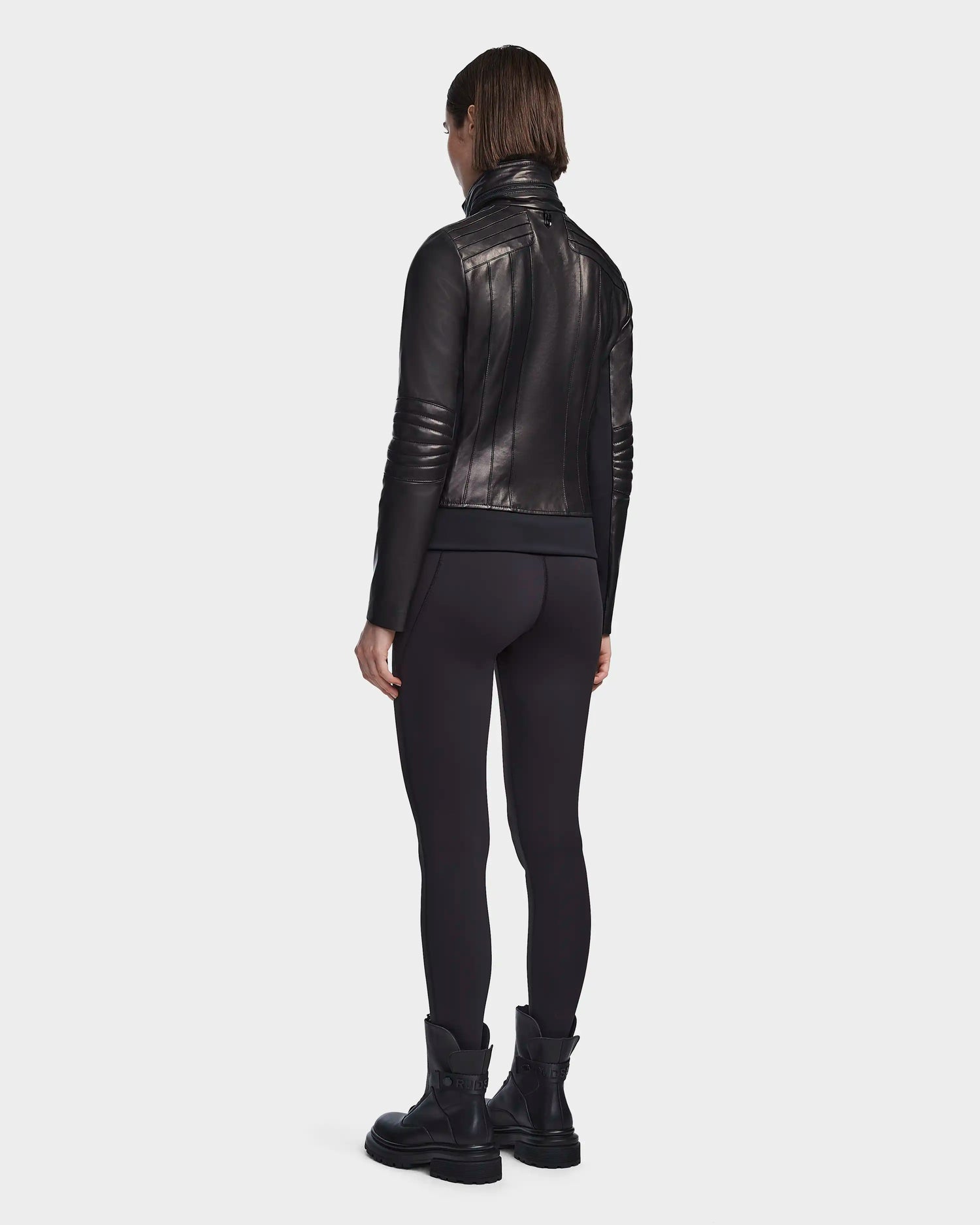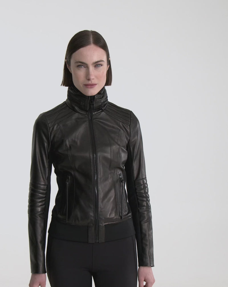 PRESLEY de RUDSAK est une veste en cuir pour femme, à la fois souple, chic et indémodable. Sa silhouette, inspirée du blouson de moto, est taillée dans du cuir d’agneau. Elle se distingue par son col cheminée, renfermant une capuche, et ses bandes en néoprène de chaque côté et sous les manches, qui ajoutent confort et aisance. Les surpiqûres matelassées aux coudes et autour du cou ainsi que les fermetures à glissière ton sur ton lui donnent son allure branchée. Un incontournable de la garde-robe féminine.