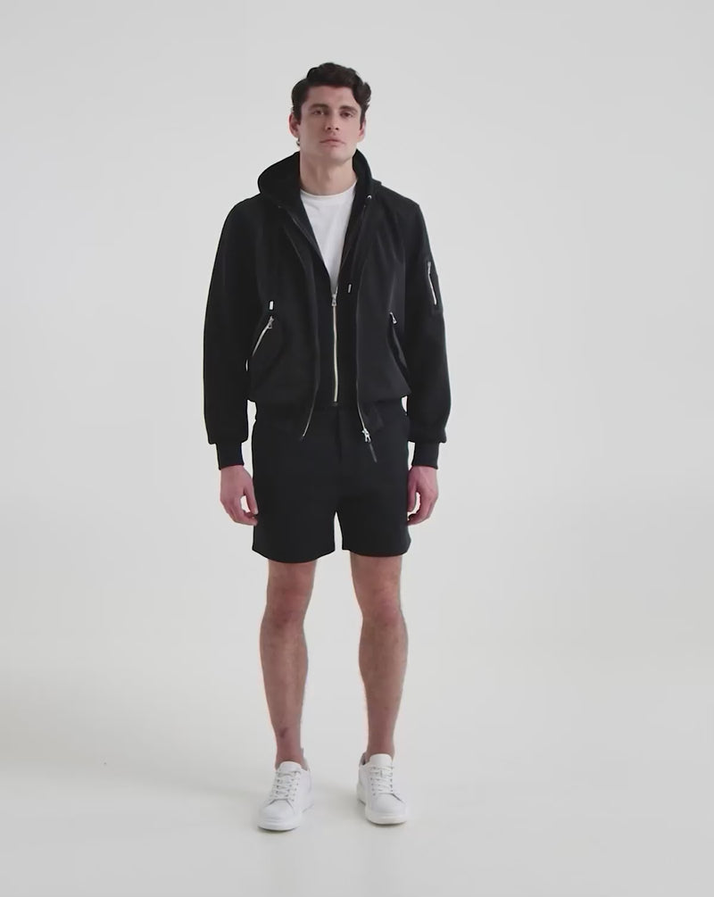 Meet ANDRE by RUDSAK, the perfect versatile layer for the season. This men's modern lightweight bomber jacket redefines modern style and features a removable hooded bib for adaptable wear. The ribbed collar, cuffs, and hem add a classic touch, while the side zipper pockets and flap pockets offer practicality. Mesh eyelets under the armhole enhance breathability, and the mini zipper pocket at the left sleeve, R logo patch, Rudsak neck tab, and inner pocket add distinctive details. Crafted from a smooth stretch shell, ANDRE combines comfort and contemporary design seamlessly, making it a must-have in every man's wardrobe.