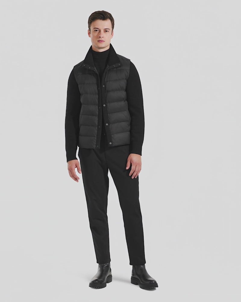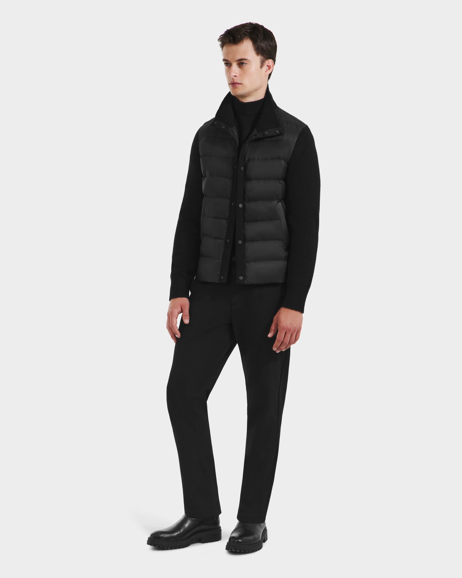 The BAILEY by RUDSAK is a men’s hybrid knit and down jacket designed for lightweight warmth and sleek, modern style. The body is crafted from water-resistant nylon and insulated with responsibly sourced down and feather fill, while the sleeves and back are made from a soft, wool-blend knit for added comfort and flexibility. Perfect for transitional weather, city layering, or travel, the BAILEY combines technical performance with a refined, tailored silhouette for effortless everyday wear.