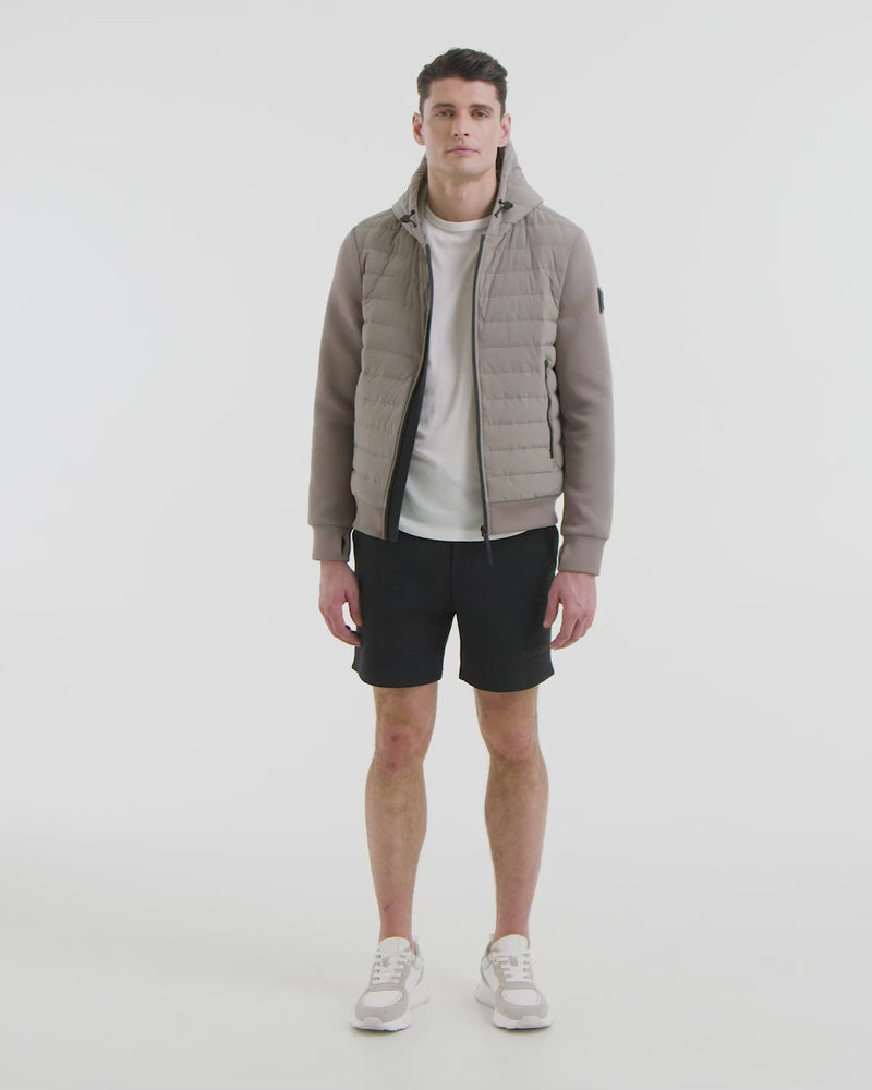 The DEE MAT by RUDSAK is a men's lightweight hybrid down jacket that offters a sleek yet sporty practical design. Crafted from a combo of extra-light fabric, this waist-length jacket features a quilted down front and upper back panel, along with a hood for added warmth. Wind and water-resistant, it includes neoprene detailing on the lower back, hem, and sleeves. Finished with waterproof zippers and RUDSAK branding, it's an essential for any urban wardrobe.
