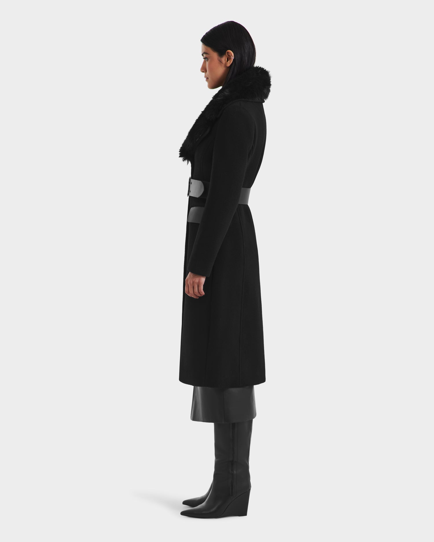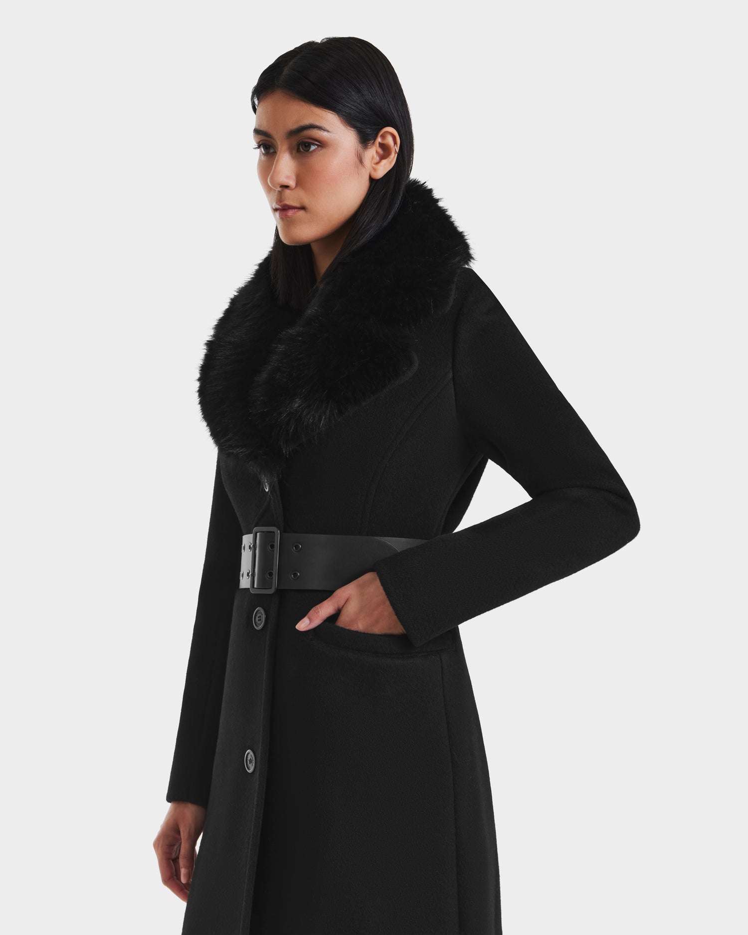The MANDY by RUDSAK is a women’s long fitted wool coat that redefines timeless sophistication. Designed with a flattering tailored silhouette, it features a removable vegan leather belt and tonal faux fur collar for customizable styling. Vegan leather flap pockets at the hips add a refined edge, blending elegance with functionality. Crafted from a premium wool blend, MANDY is a classic outerwear staple—perfect for elevating cold-weather dressing with signature RUDSAK polish and modern versatility.